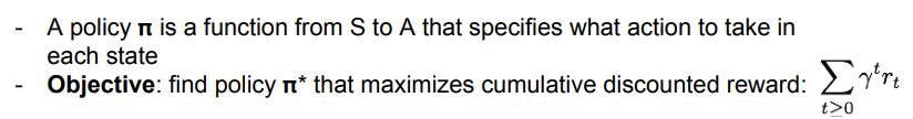 - policy pi : 각 state에서 agent가 어떤 action을 취할지 명시하는 함수 (S->A)