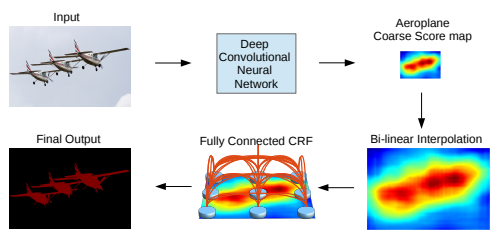DCNN의 출력 coarse score map을 bi-linear interpolation으로 upsampling 해서 기존 이미지의 크기로 확대한다. 이후 full-connected CRF로 결과를 정제해서 정확도를 높인다.