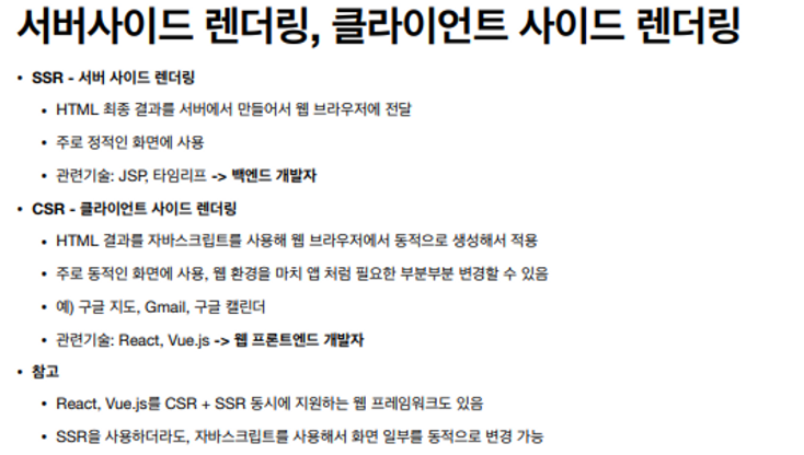 - 웹 브라우저가 서버에 HTML 요청 > 서버에서 빈 HTML에 자바스크립트 링크만 넣어서 응답