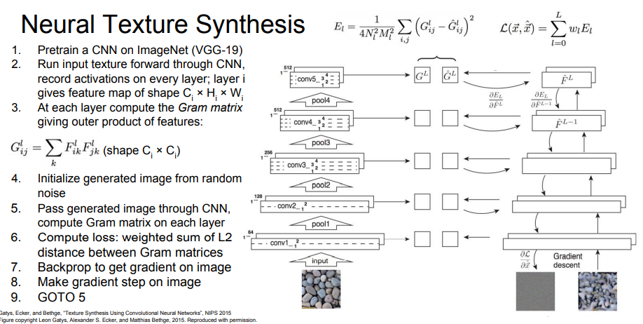 - Texture synthesis(Gram reconstruction) + Feature Inversiion(feature reconsturction)