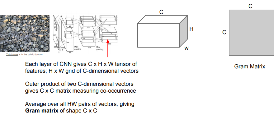 이 CxC matrix를 average 하면 spatial information은 사라지고 co-occurrence만 담고 있는 gram matrix를 얻을 수 있다. 이렇게 구한 Gram matrix를 이미지의 texture를 묘사하는 texture descriptor로 사용한다.
